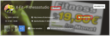 Zur Optimierung des Google My Business Eintrags ist es vor allem wichtig, die richtige Kategorie aus zu wählen, im folgenden Beispiel die Kategorie Fitnessstudio. Hier sollte immer die jeweilige Unternehmensart eingetragen werden, nicht eine einzelne Dienstleistung oder ein Produkt des Unternehmens.