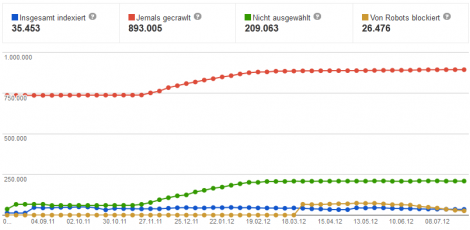 Wann hattest du wie viele Unterseiten im Google Index? Durch wie viele Seiten hat sich der Google-Bot jemals gecrawlt? Und: Wie viele davon hat er wieder verworfen? Was wir bisher nur ahnen konnten, zeigt u ns Google nun mit dem neuen “Indexierungsstatus” in den Google Webmaster Tools.