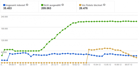 Im vorliegenden Fall zeigt der Indexierungsstatus der Google Webmaster Tools sehr schön, dass hier etwas mit den Indexierungseinstellungen der Website nicht stimmt. Aktuell sind gerade einmal 35.000 URLs indexiert (blaue Linie), während beinahe eben so viele URLs via robots.txt-Datei gesperrt sind (braune Linie) und sogar 6-mal soviele URLs gar nicht ausgewählt (grüne Linie) wurden. Insbesondere der starke Anstieg der nicht ausgewählten Seiten ab Ende November 2011 sollte untersucht werden.