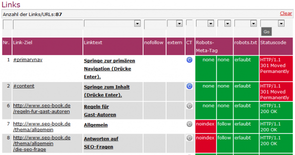 Am besten umgesetzt wird das derzeit von onpage.org (mittlerweile ryte.com). Hier ist es möglich sich alle Werte einer einzelnen URL anzusehen. Außerdem gibt es natürlich auch hier die Möglichkeit sich alle Seiten auflisten zu lassen, die via Robots-Meta-Tag gesperrt sind. Aber auch in onpage.org konnte ich leider keine Liste finden, die mir wirklich alle ausgehenden Links einer bestimmten URL inkl. der oben erwähnten Informationen anzeigt. Das wäre doch ein cooles neues Feature und würde super in das Tool passen, oder?