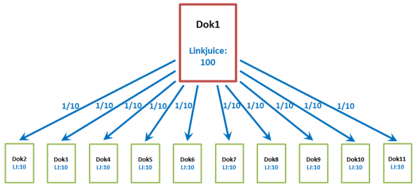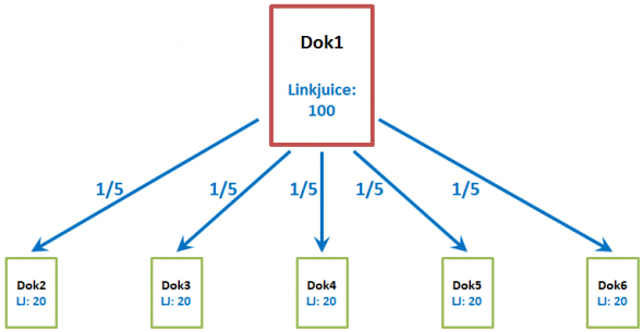Beispiel für die Verteilung des Linkjuice: Steht einer Seite (in der Grafik mit „Dok1“ gekennzeichnet) ein fiktiver Linkjuice von 100 zur Verfügung und das Dokument verlinkt auf 5 Dokumente/Unterseiten, so erhält jedes dieser Dokumente 1/5 des Linkjuice von Dok1, also einen Linkjuice von 20.